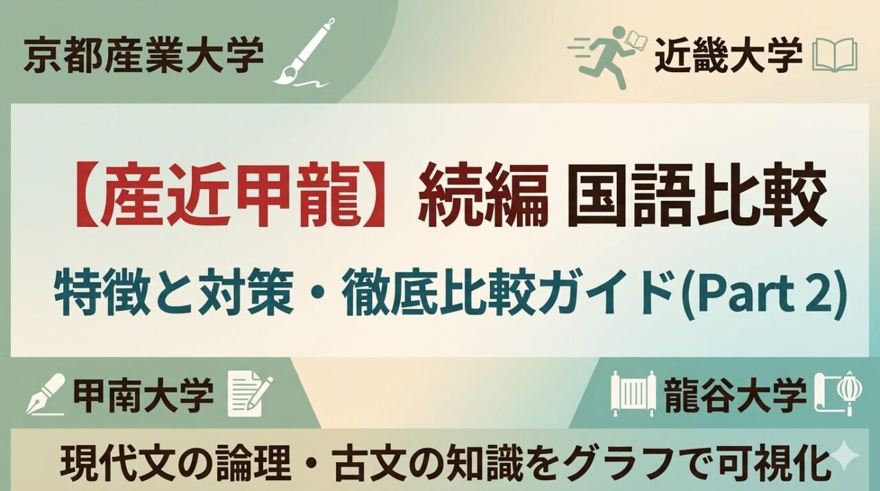 【産近甲龍】国語入試の傾向と対策・徹底比較ガイド ~自分に合うのはどこ?現代文の論理・古文の知識をグラフで可視化~ 産近甲龍の国語は、英語以上に各大学の「色」が強く出ます。 「現代文は得意だけど古文が苦手」「文学史の暗記が苦痛」といった受験...